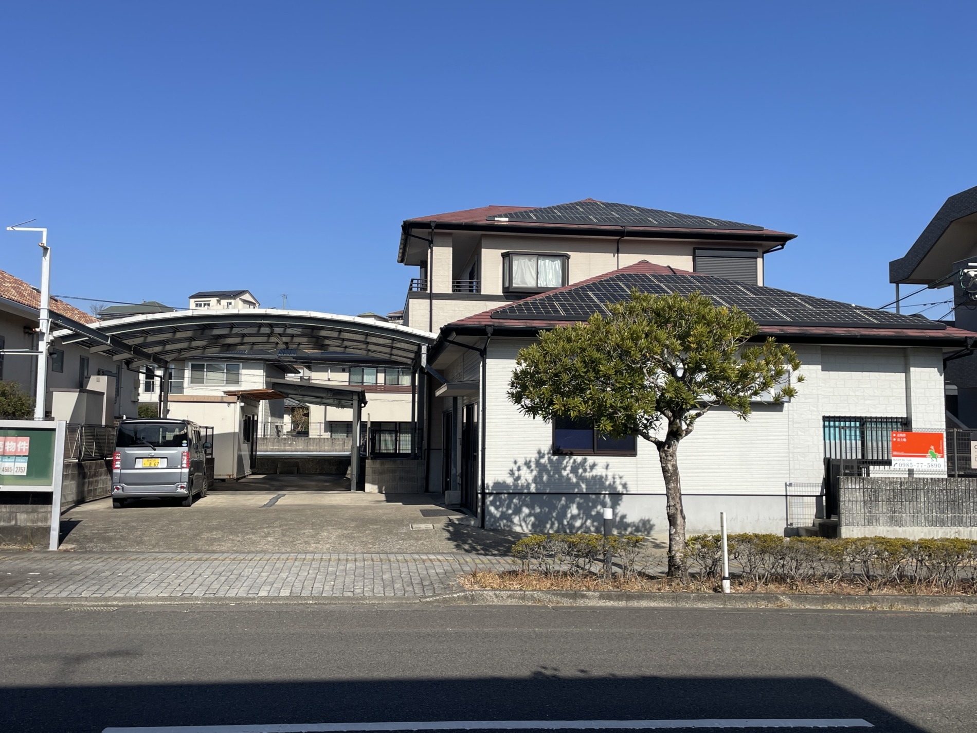 ・宮崎市花山手西1丁目の物件です。住宅に店舗・事務所部分が付いています。物件南側・北側に道路・東側に歩道があります。